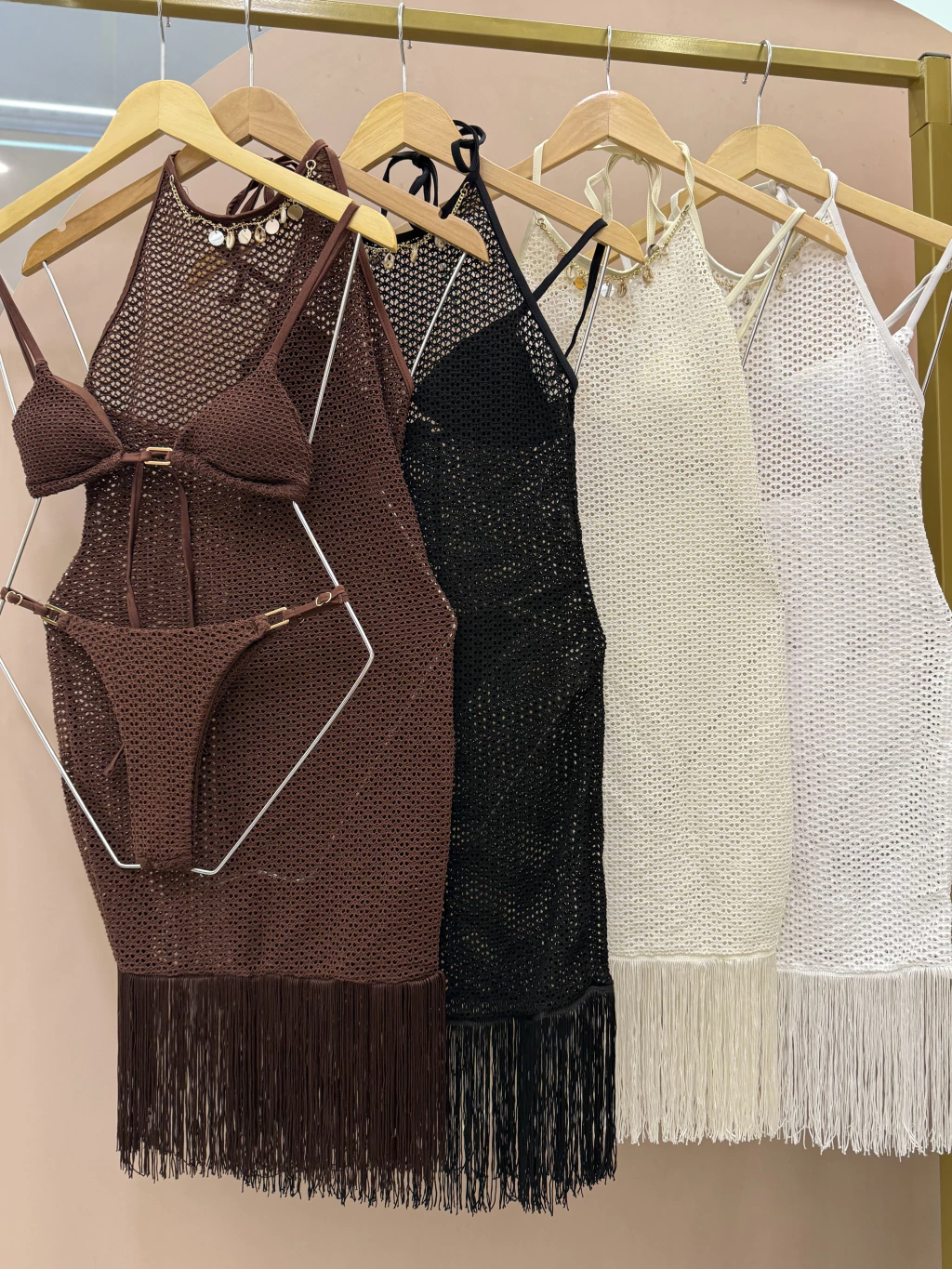 O Conjunto Pérola é composto por 3 peças (biquíni e saída de crochê com franjas), unindo elegância e conforto. Produzido em tecido leve e moderno, valoriza o corpo e traz um toque sofisticado para os dias de sol.